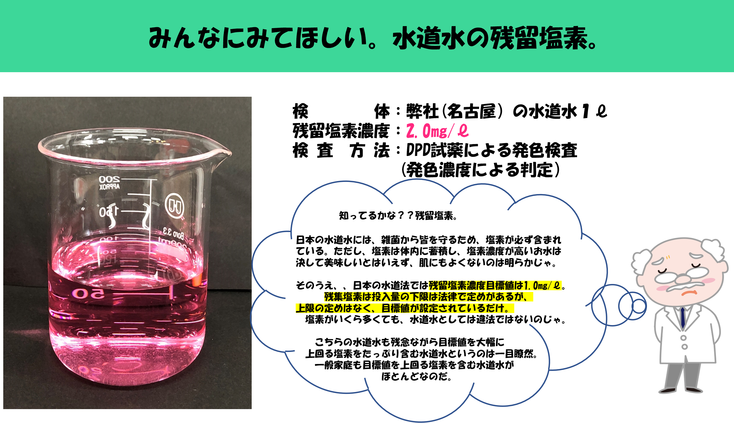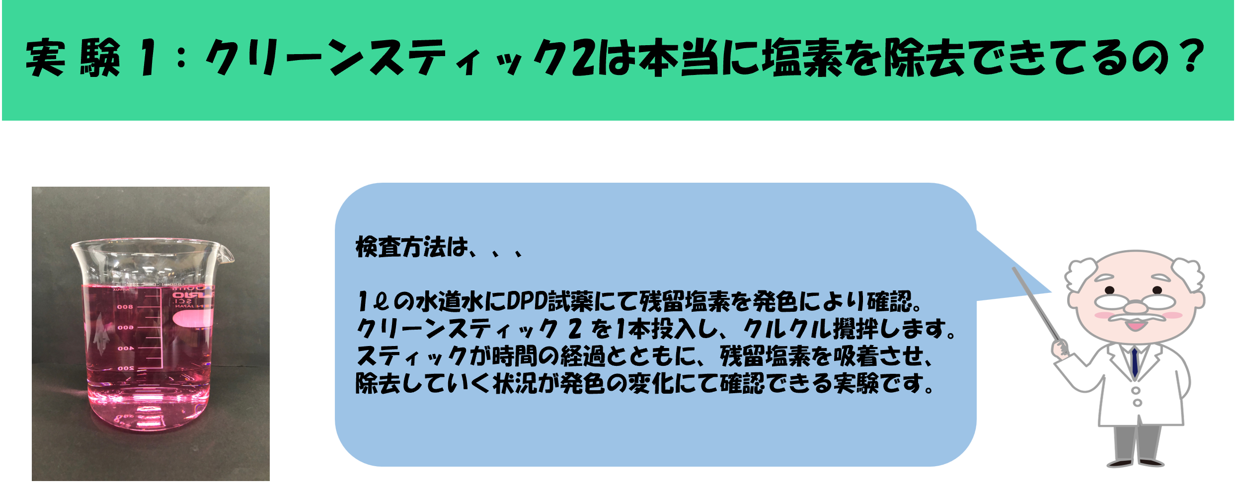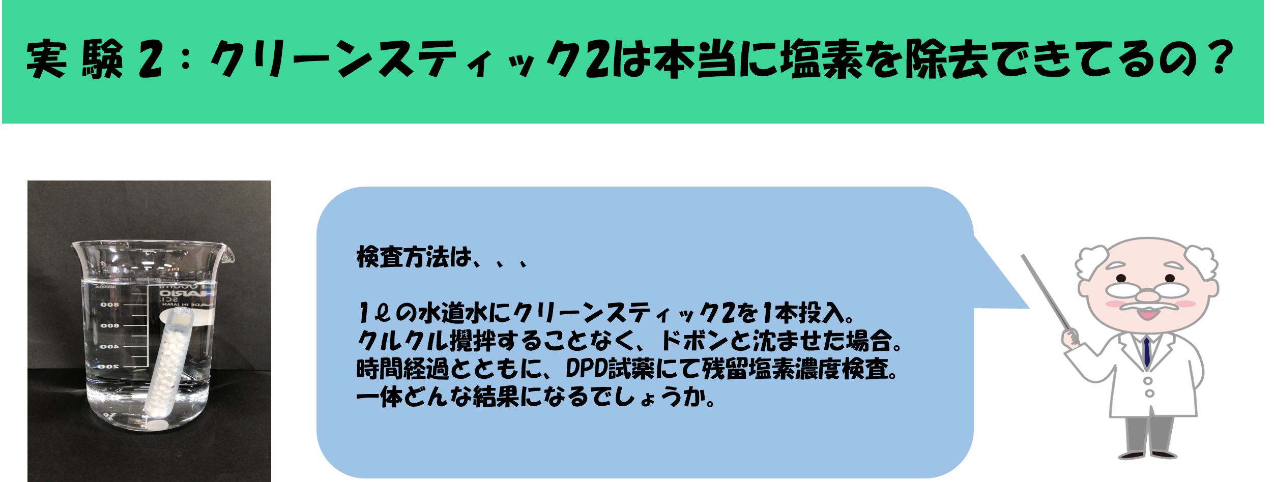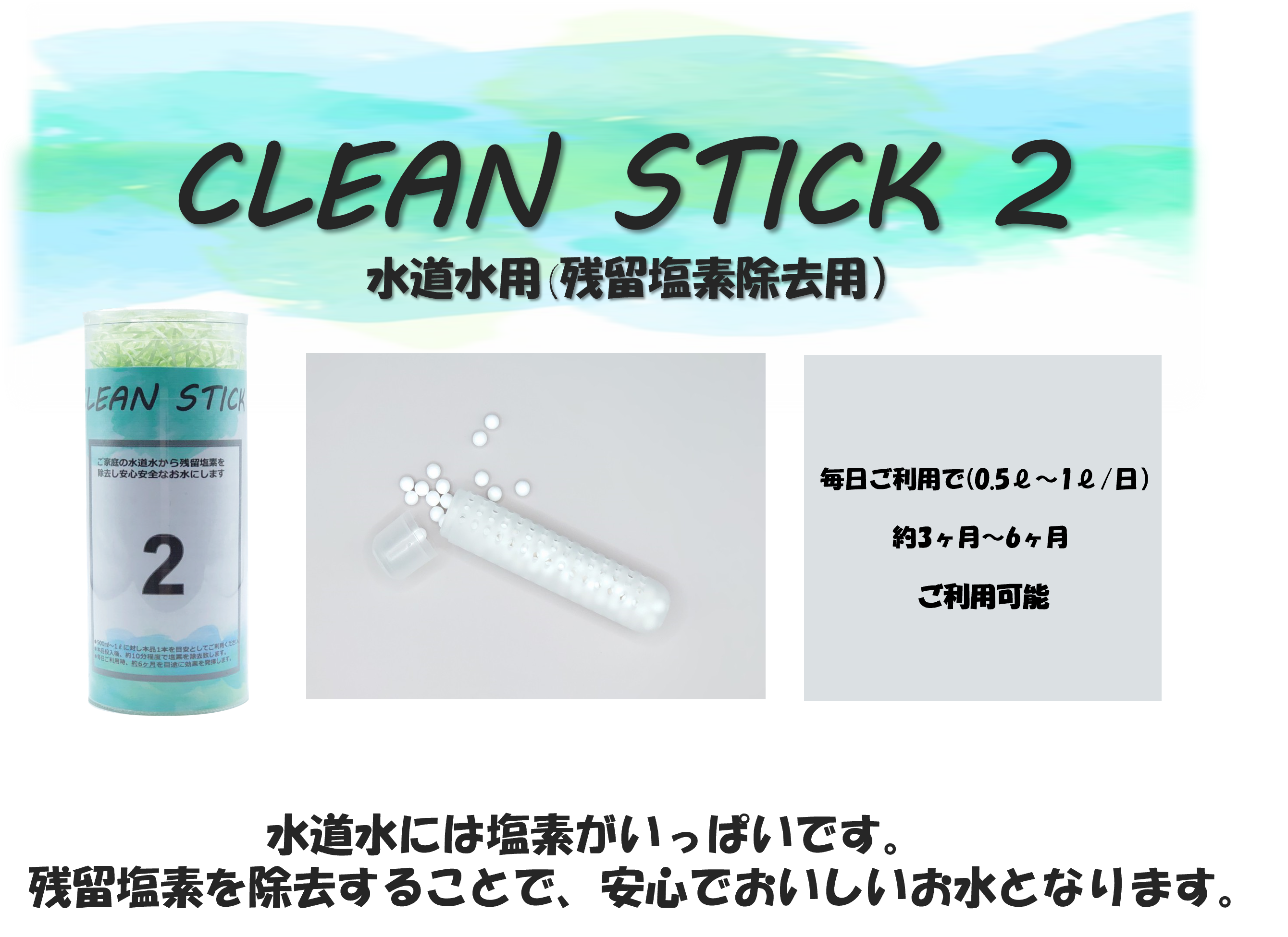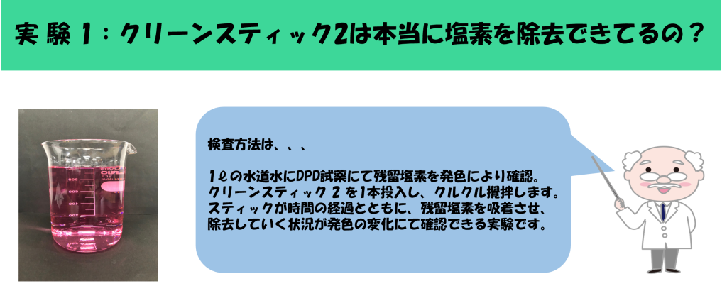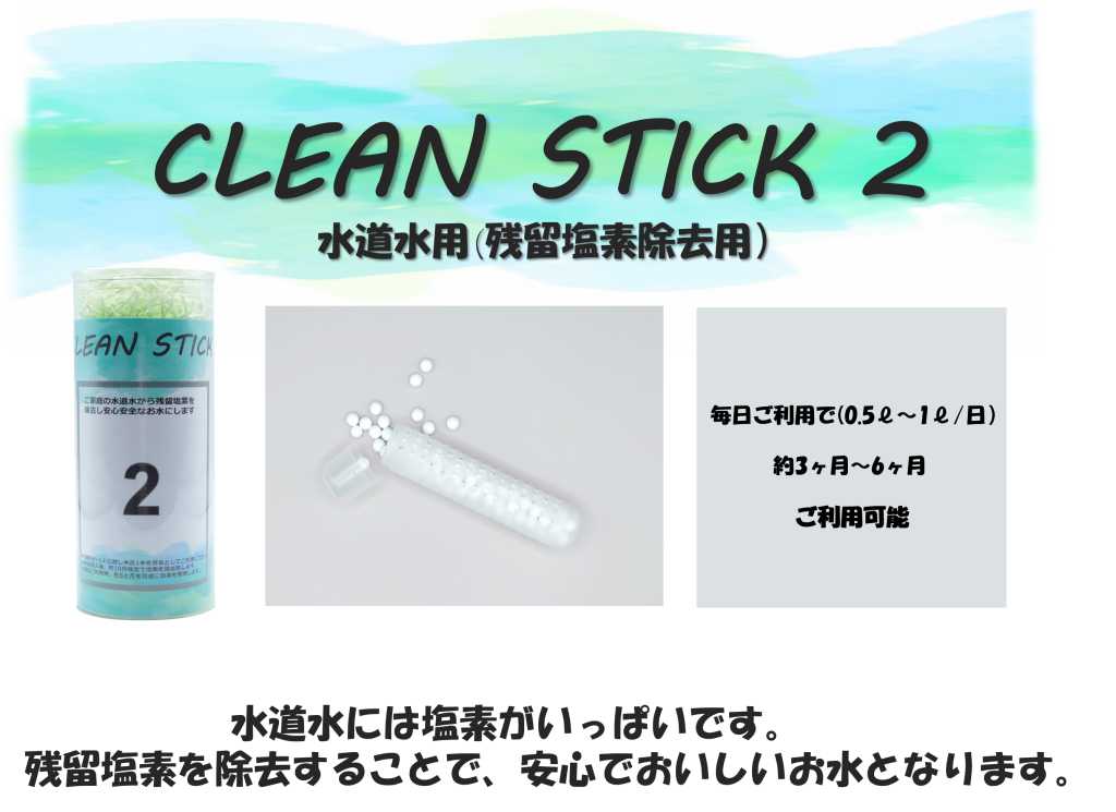 塩素は、世界で初めて化学兵器として使用された化学物質でもあり、残留性もあることから人体に有害性があることは明らかです。 しかし皮肉なことに、塩素には強い消毒性もございますので、水道水を安心な安全なお水として家庭内にお届けするには必要な物質です。 残留性があるため浄水場により塩素消毒したお水も万が一その先に細菌などに接触してしまった場合においても、消毒され無害化できるのです。 つまり、この残留性が消毒の役目を終えても人の体に入ってくる厄介なものになるのです。そこでクリーンスティック2をご利用いただきますと残留塩素を検出することはなくなります。