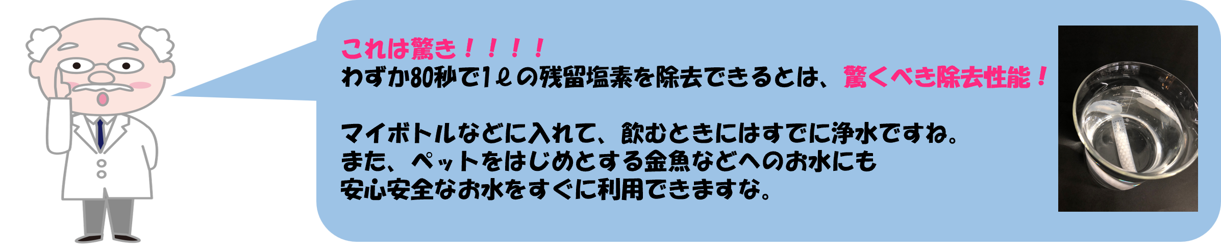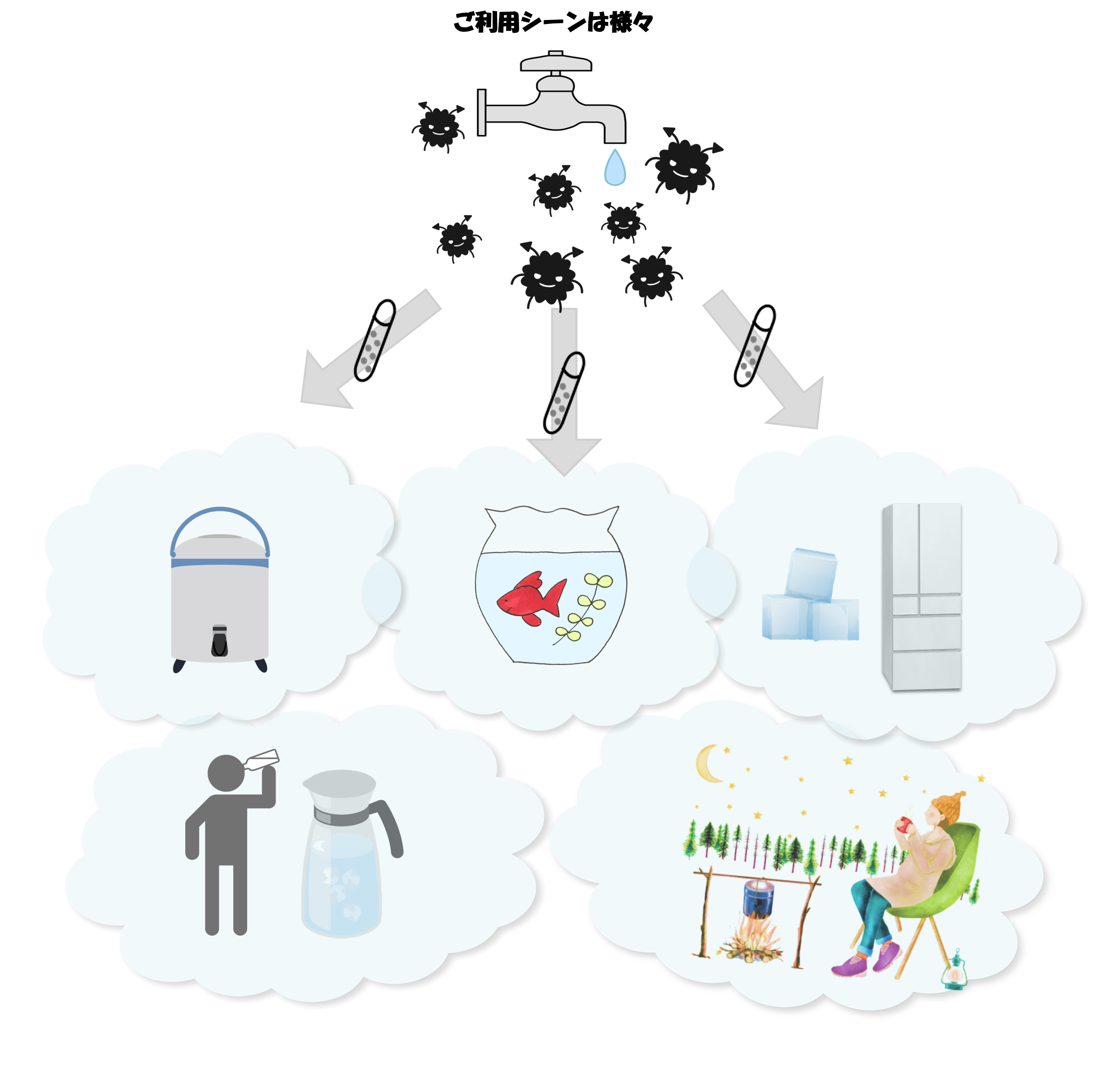 水道水に含まれる残留塩素を取り除く目的にて企画された商品です。使用シーンは様々で携帯していただくことで、場所をとわず、誰でも容易に浄水をつくることが出来ます。